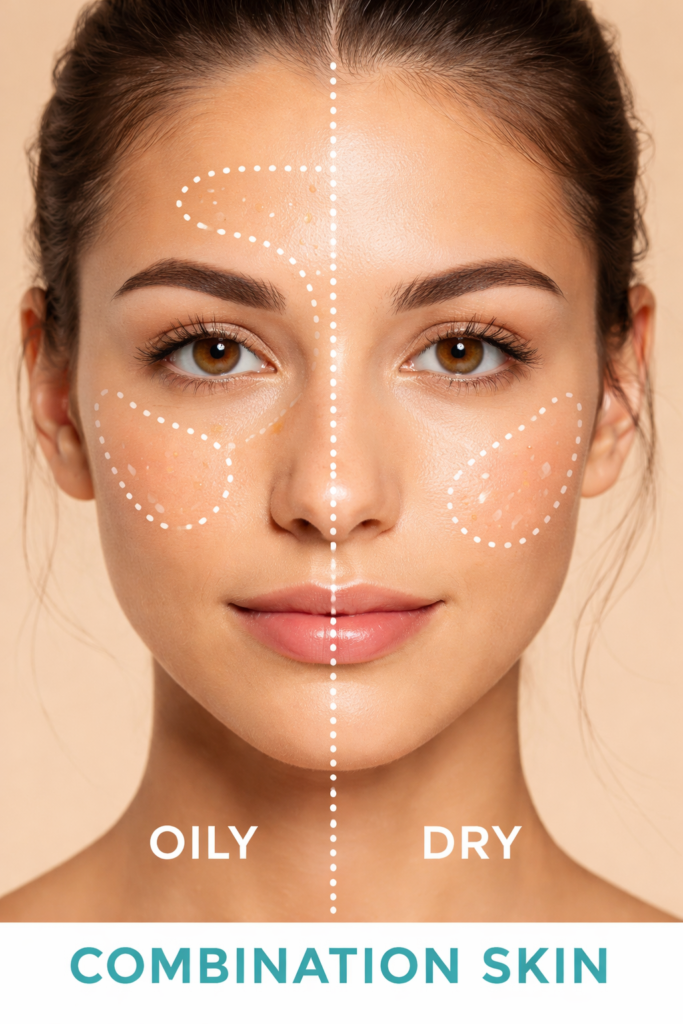 Combination Skin can be challenging to manage because it often includes both oily and dry areas on the face. Many people notice oiliness in the T-zone — the forehead, nose, and chin — while the cheeks may feel dry or tight.